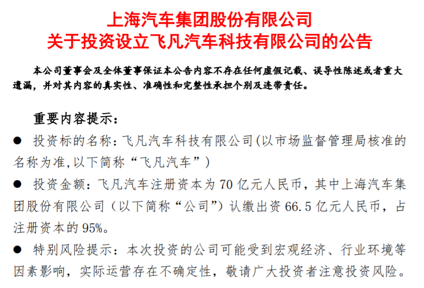 29 日消息,今日下午,上汽集团发布公告称,为加快发展中高端智能电动车自主品牌,公司拟投资设立飞凡汽车科技有限公司。