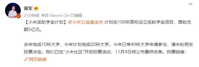29 日消息,今日晚间,雷军发微博称,小米公益基金会计划在 100 所高校设立奖助学金项目,赞助总额 5 亿元。去年完成 10 所大学,今年计划完成 20 所大学。