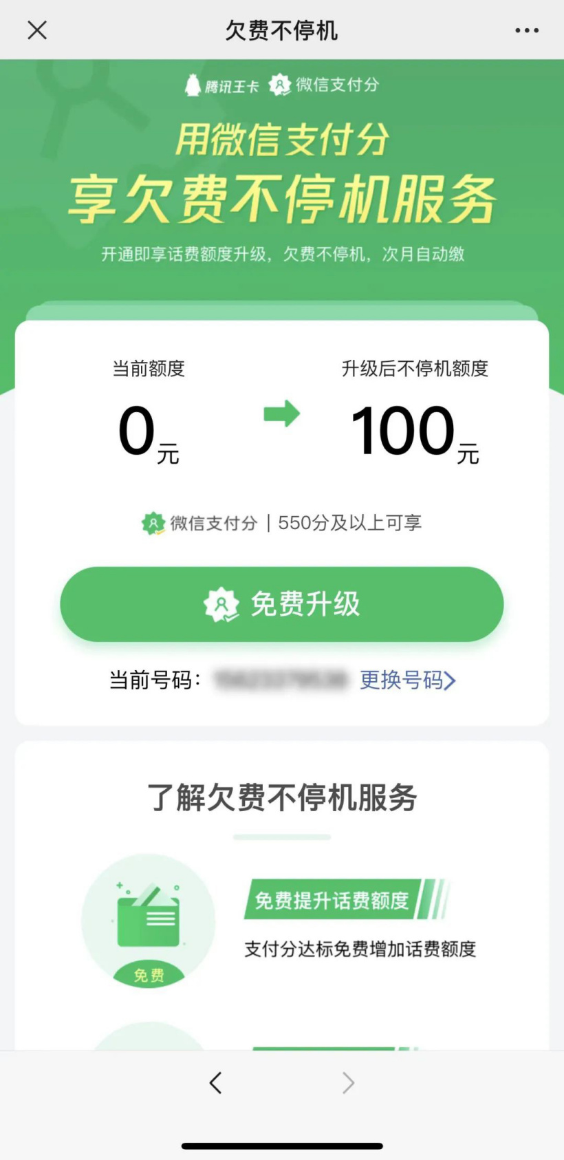 目前,“欠费不停机”服务主要面向国内大部分地区的王卡用户,用户微信支付分 550 分及以上就可以申请使用。服务提供的“欠费额度”有 100 元、120 元、150 元三档,用户清缴欠费或欠费自动代扣后,额度会自行恢复