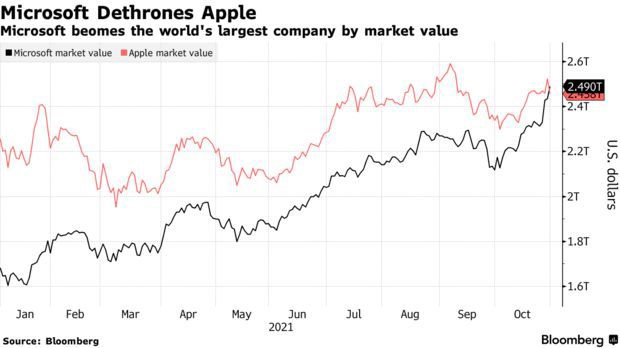 雅虎财经的数据显示,截至当地时间周五美股收盘,微软股价上涨 2.24%,市值达到 2.49 万亿美元。与此同时,苹果股价下跌 1.82%,市值降至 2.48 万亿美元。微软把苹果从世界最高市值的宝座上赶了下来。