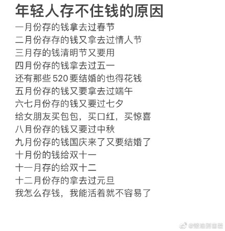 交完房租(房租都能占收入的三分之一甚至更多),再除去吃穿等日常生活费、社交人情送礼、外出交通、恋爱花销、网络通讯等费用,基本上也就存不下什么钱了,要是还有孩子、家中有病人、有房D/车D要还的话,日子就更难过,能收支平衡、不负债就不错了。