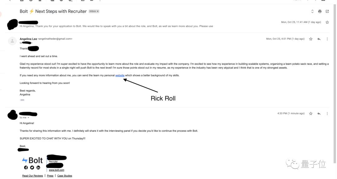 而且天使姐在邮件交流过程中,链接里附带的依旧是 Rickroll 整蛊的图片。