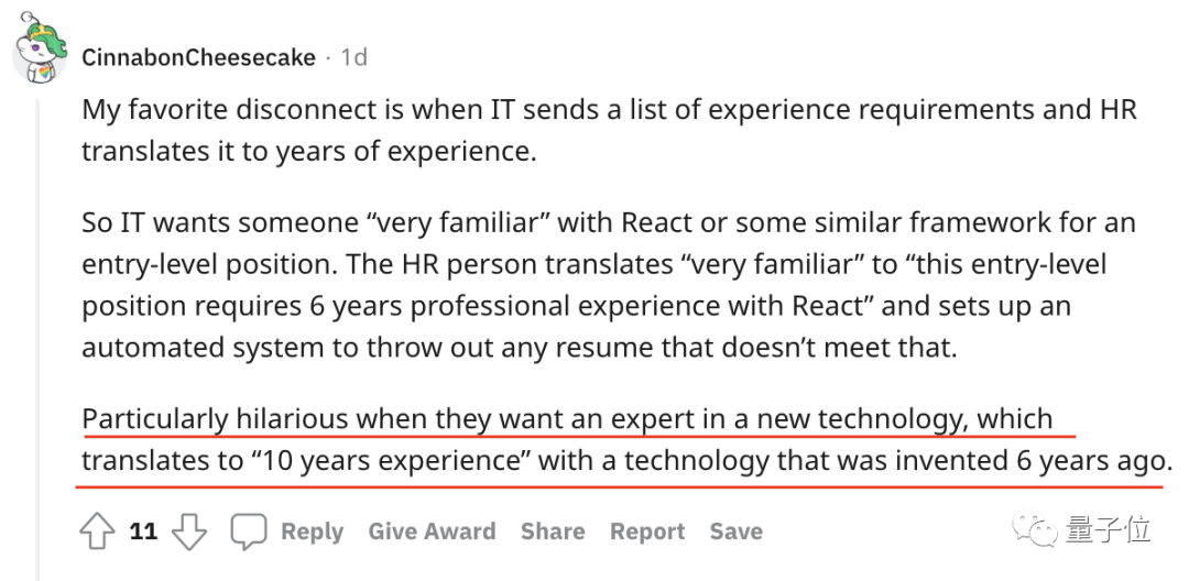比如说要招聘新技术领域的专家,技术部门的描述是“非常熟悉 React 或类似框架”,而 HR 则将这个“非常熟悉”翻译或者理解成了“需要在 React 框架上有 6 年经验”。