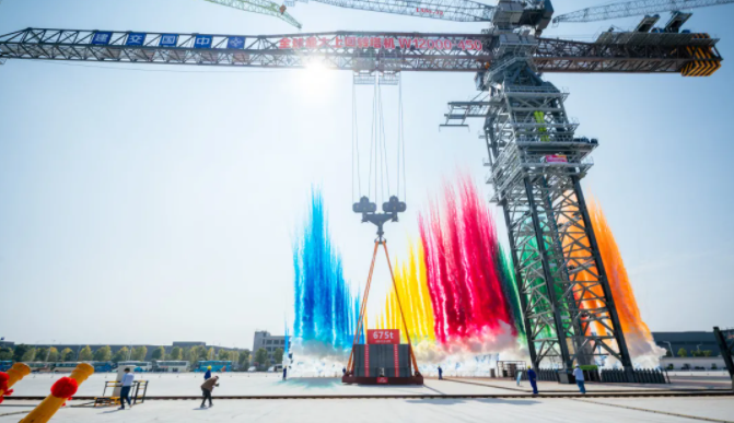 据介绍,该塔机重达 4000 吨,额定起重力矩达 12000 吨米,是全球首台超万吨米级的上回转超大型塔机。该塔机最大起重重量达到 450 吨,最大起升高度 400 米,相当于可以一次起吊 300 辆小轿车至 130 层楼的高度。