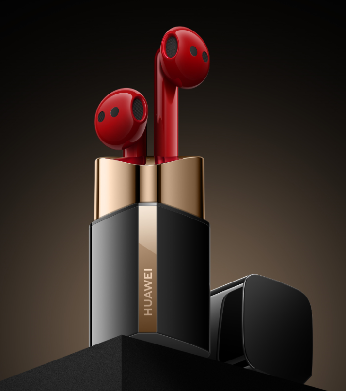 这款 FreeBuds Lipstick 耳机采用口红设计,耳机盒是金色、黑色相间的类似口红样式,耳机本体则是深红色。