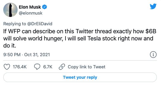 马斯克在 Twitter 上表示:“如果 WFP 能够在这个 Twitter 主题帖子上使用透明和公开的会计方法详细解释如何使用 60 亿美元解决全球饥饿,我会马上出售特斯拉股票,来解决饥饿问题。”