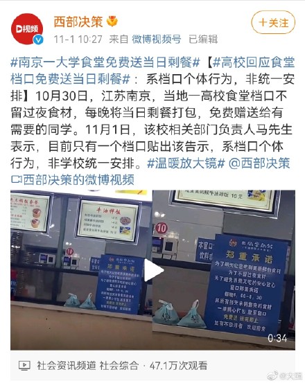10月30日,江苏南京。南京一大学食堂窗口,为保证新鲜又不浪费,每晚将当日剩餐打包,免费送给有需要的同学。网友:为这一举动点赞,求推广!
