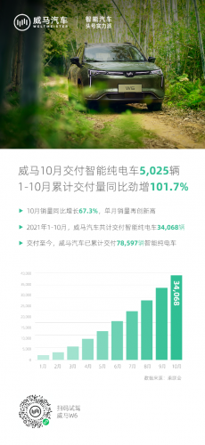 据乘联会数据显示,2021 年 10 月威马汽车交付智能电动汽车 5,025 辆,同比攀升 67.3%,再创单月销量新高。