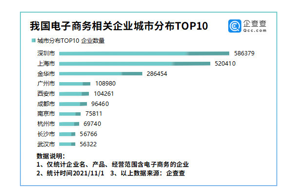 从城市分布来看,深圳位居榜首,拥有 58.64 万家电子商务相关企业。上海市、金华市分别有电子商务相关企业 52.04 万家、28.65 万家,位居前三。此后依次为广州市、西安市、成都市等。