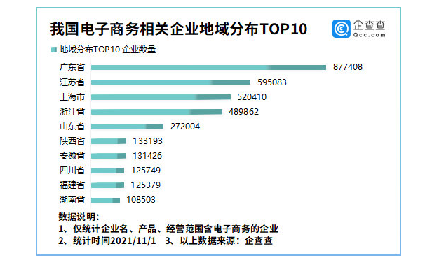 ,从区域分布来看,广东以 87.74 万家电子商务相关企业排名第一,江苏省、上海市分别有 59.51 万家、52.04 万家电子商务企业,排在第二、三名。此后依次为浙江省、山东省、陕西省等。