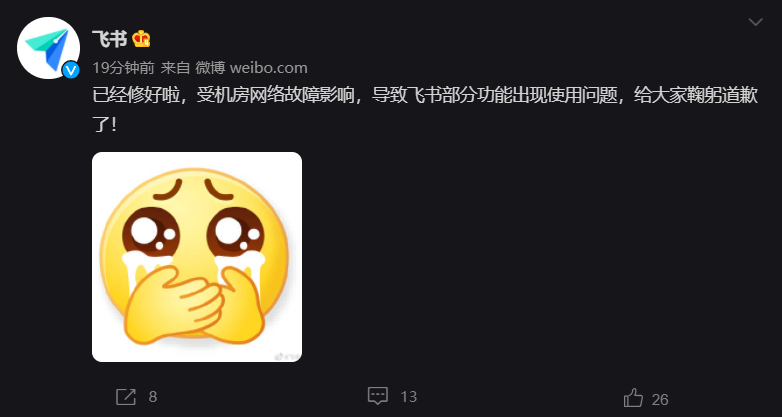 飞书官方微博下午 1 点作出回应,表示受机房网络故障影响,导致飞书部分功能出现使用问题,已经修好了。