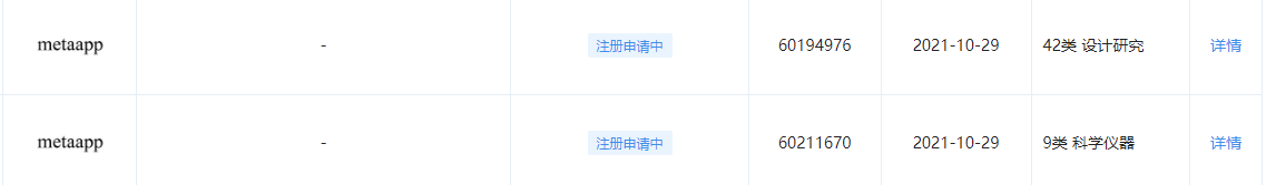 现有网友发现,百度在线网络技术 (北京) 有限公司申请注册“ metaapp ”商标,国际分类涉及网站服务、科学仪器等。目前商标状态均为申请中,申请时间是 10 月 29 日,也就是 Facebook 宣布改名的当天。