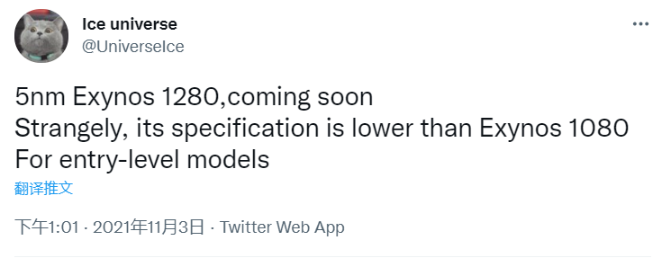 11 月 3 日消息,根据 Twitter 用户 @UniverseIce 的爆料,三星正在研发一款入门级的 Exynos 系列 SoC,目前得知该款 SoC 的型号为 Exynos 1280。