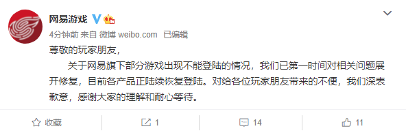 对此,网易游戏表示已第一时间对相关问题展开修复,目前各产品正陆续恢复登陆,深表歉意,感谢大家的理解和耐心等待。