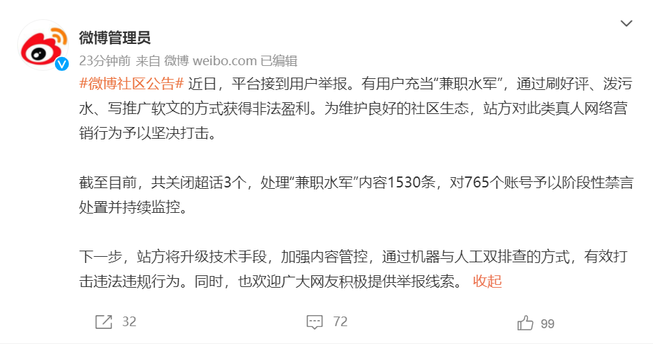 具体来看,截至目前微博共关闭超话 3 个,处理“兼职水军”内容 1530 条,对 765 个账号予以阶段性禁言处置并持续监控。