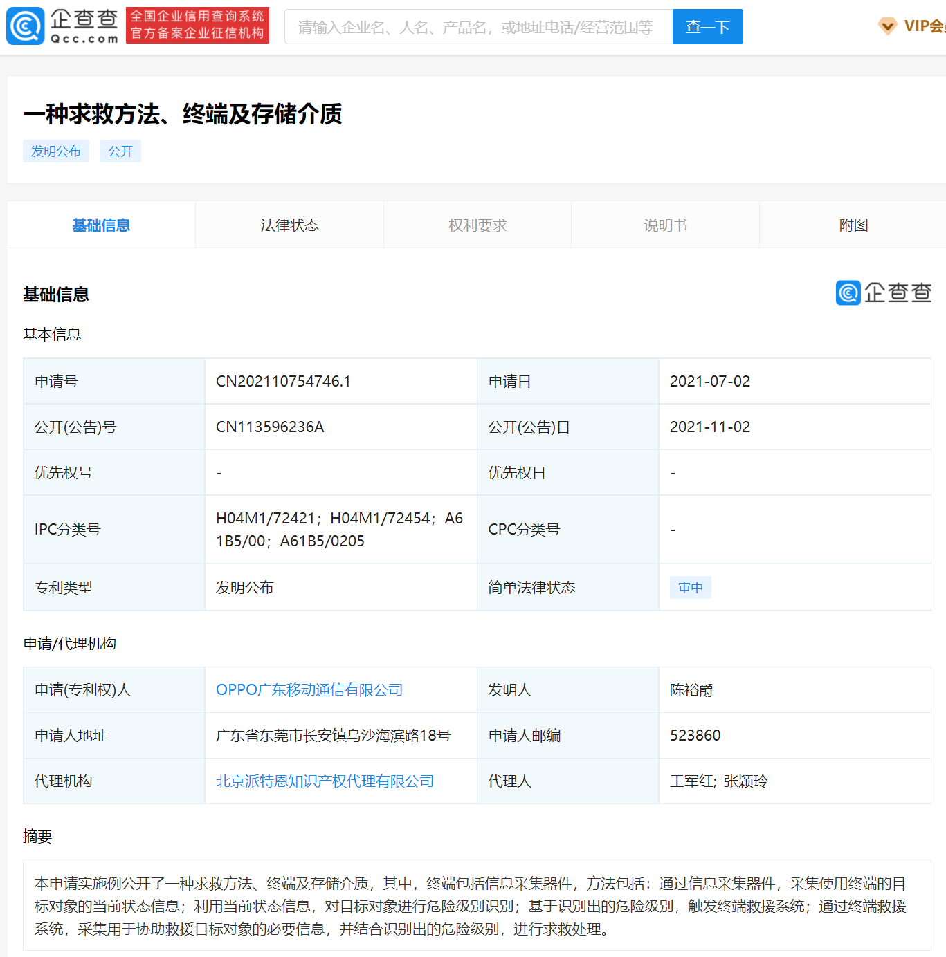 5 日消息,OPPO 广东移动通信有限公司 11 月 2 日公开了“一种求救方法、终端及存储介质”专利,公开号为 CN113596236A。