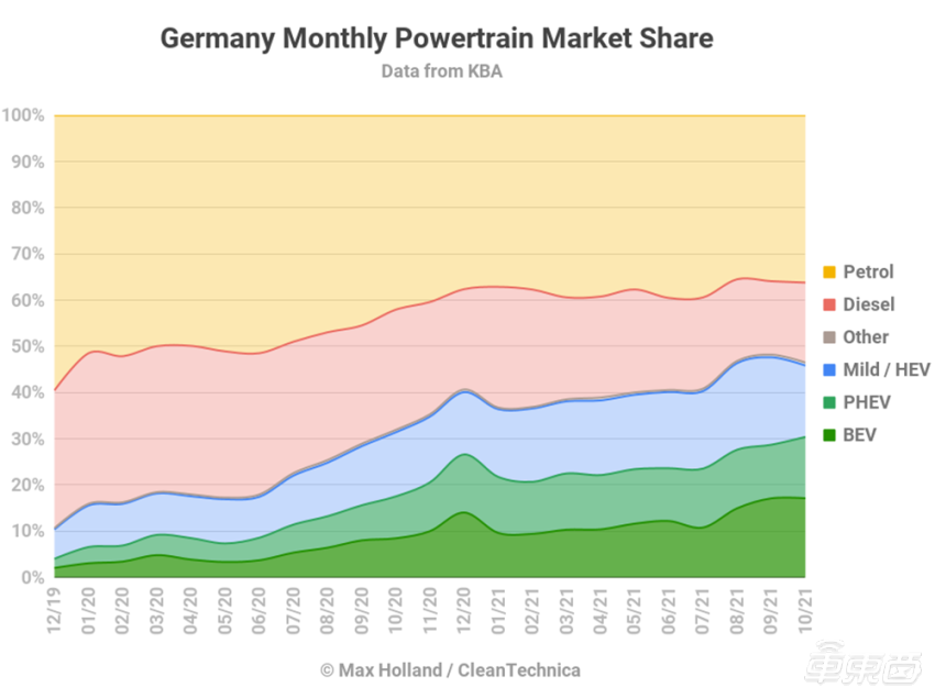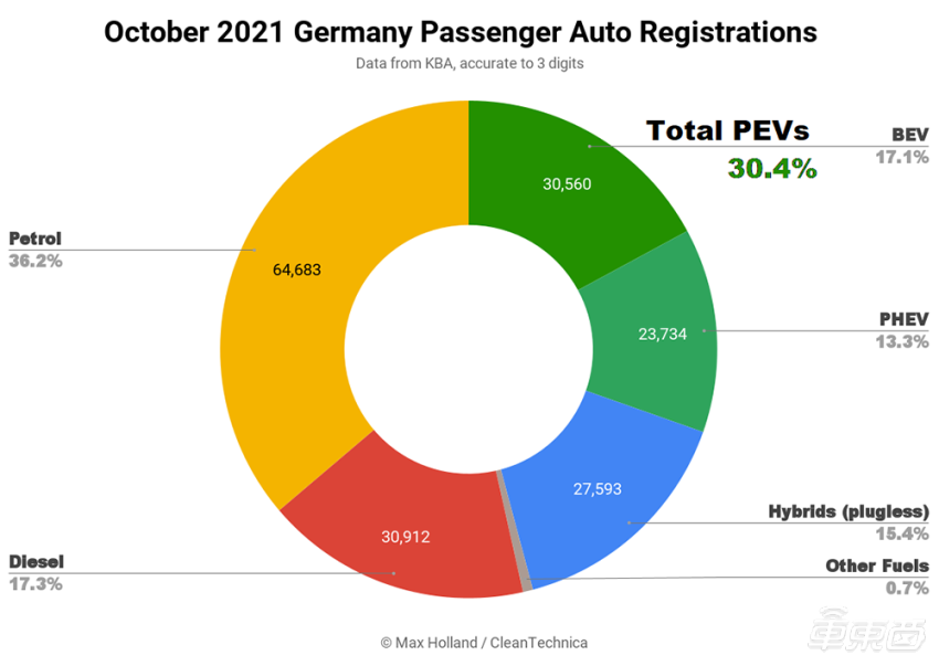 11 月 6 日消息,据外媒 CleanTechnica 报道,10 月份德国电动汽车(包括纯电和插混车型)销量为 54294 辆,销量紧随汽油车和柴油车之后,占汽车总销量的 30.4%,同比增长约 175%。