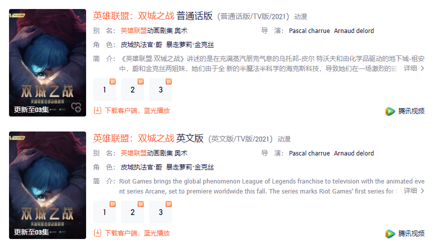 7 日消息,据英雄联盟官方微博,英雄联盟首部动画剧集《英雄联盟:双城之战》在今日开启全球首映,在腾讯视频、掌上英雄联盟、《双城之战》官方网站全网独播。