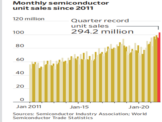 ▲ 根据 Semiconductor Industry Association 和 World Semiconductor Trade Statistics 资料整理的 2011 年以来的半导体月度单位销售额。图源:华尔街日报