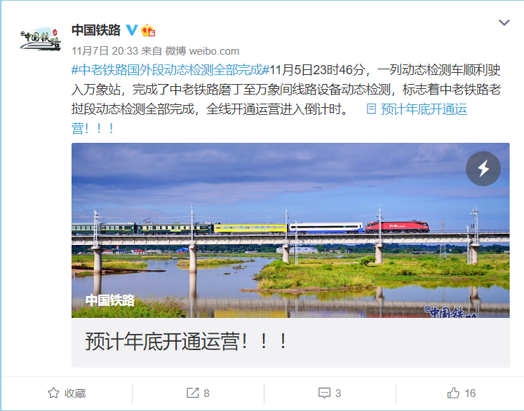 11 月 8 日消息,11 月 5 日 23 时 46 分,一列动态检测车顺利驶入万象站,完成了中老铁路磨丁至万象间线路设备动态检测,标志着中老铁路老挝段动态检测全部完成,全线开通运营进入倒计时。