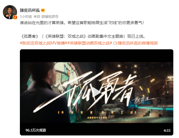 《英雄联盟:双城之战》的中文主题曲《孤勇者》已经上线 QQ 音乐、酷狗音乐、酷我音乐。“听我一腔孤勇,双城等你来战。”