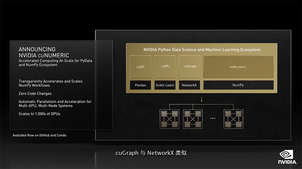 第三个加速库是在 PyData 和 NumPy 生态系统的大规模加速计算 cuNumeric,它允许用户用 Python 代码在超级计算机上透明加速和扩展 NumPy 工作流,并无需更改代码。