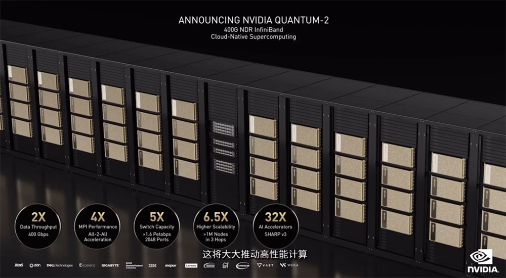 Quantum-2 InfiniBand 拥有 400Gbps,网络速度翻倍,交换机吞吐量增加了 2 倍,集群可扩展性增为原来的 6.5 倍,同时降低了数据中心的功耗。