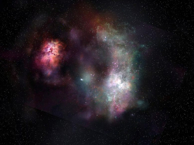 ▲ 这幅想象图显示了双星系 SPT0311-58 中的尘埃连续体,以及一氧化碳和水的分子线。ALMA 的数据显示,在这两个星系中,较大的那个星系具有丰富的一氧化碳和水,表明在元素最初形成后不久,宇宙中的分子就变得普遍起来