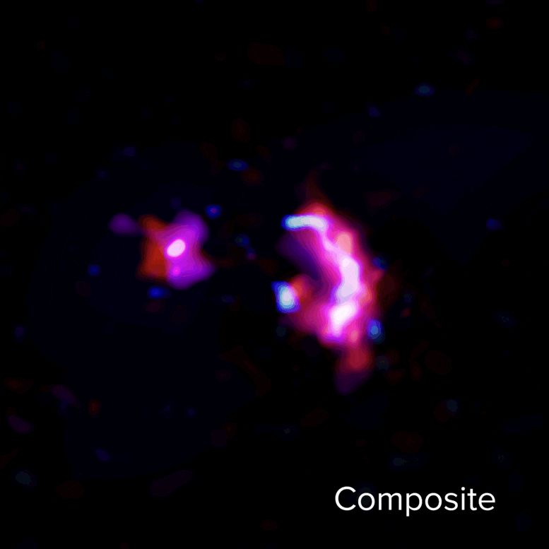 ▲ 这张动图显示了早期大质量星系 SPT0311-58 中尘埃连续体以及水和一氧化碳的分子线移动情况。动图开始是尘埃连续体与水和一氧化碳分子线的组合;之后是红色的尘埃连续体和蓝色的水分子线;一氧化碳的分子线包括粉色和深蓝色的 CO(10-9)、品红色的 CO(7-6)和紫色的 CO(6-5)