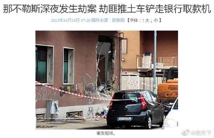 据欧联通讯社报道,当地时间11月9日凌晨4时左右,意大利那不勒斯市的镇上,发生一起银行抢劫事件。劫匪使用一辆推土车,直接铲走一家银行的自动取款机,并用数辆卡车堵在通往银行的街道上,以阻碍警方的追踪。