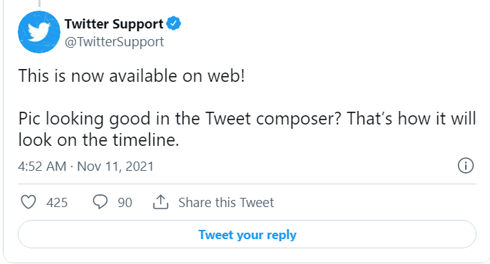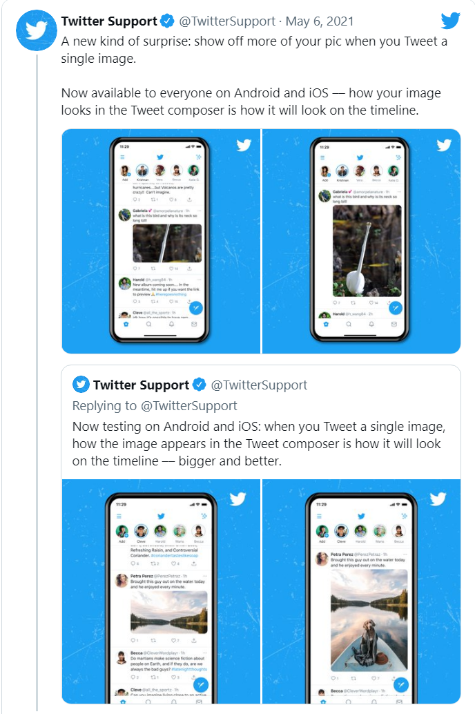 这意味着用户将不再需要点击图片就能看到完整的图片,这是一个非常受欢迎的改进,那些在 Twitter 上发布图片的用户将清楚地知道他们的粉丝会看到什么。