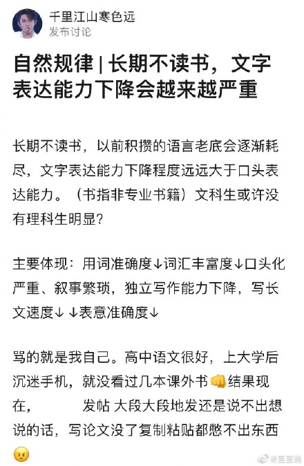 v朋友们,你们觉得长期不读书自己的表达能力会有下降吗?