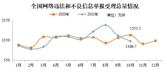 13 日消息,根据网信办消息,2021 年 10 月,全国各级网络举报部门受理举报 1306.7 万件,环比下降 14.3%,同比下降 15.8%。其中,中央网信办(国家互联网信息办公室)违法和不良信息举报中心受理举报 30.3 万件,环比下降 32.5%、同比增长 59.5%;各地网信办举报部门受理举报 105.6 万件,环比下降 1.6%、同比下降 4.6%。
