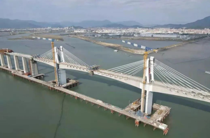 该桥除连续梁外全部采用 40.6 米箱梁设计,是福厦高铁唯一一座 40.6 米箱梁桥。东南沿海铁路福建公司和施工单位秉持建“精品工程、智能福厦”理念,采用自主研发的“昆仑号”千吨级运架一体机和大跨度移动模架制梁机,分别从南向北进行海面架梁作业、由北向南进行现浇梁施工,一举解决了施工周期以及大跨度海上现浇梁等施工难题。