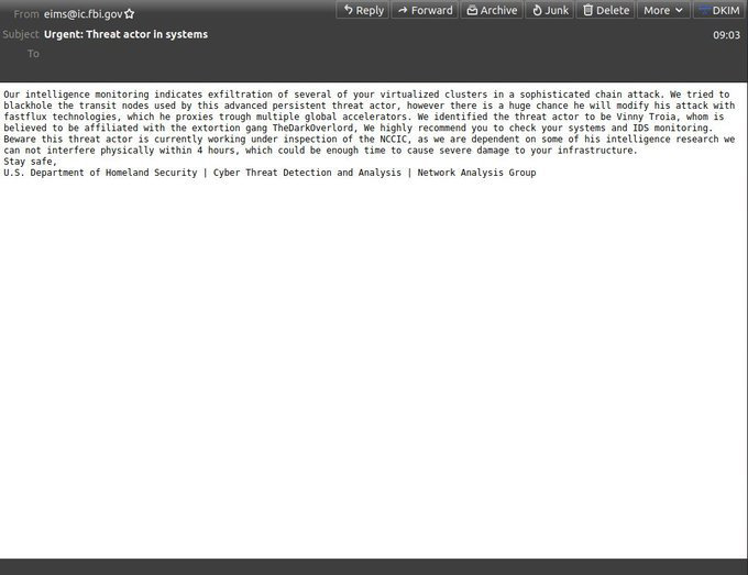 这些邮件使用的主题是“紧急:系统中存在威胁行动者”,由美国国土安全部签署。黑客在邮件中警告收件人称,威胁行动者似乎是网络安全专家维尼?特罗亚 (Vinny Troia)。去年,特罗亚曾对黑客组织“黑暗霸王”(Dark Overlord) 进行过调查。