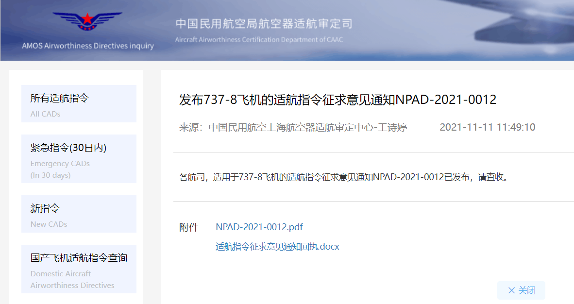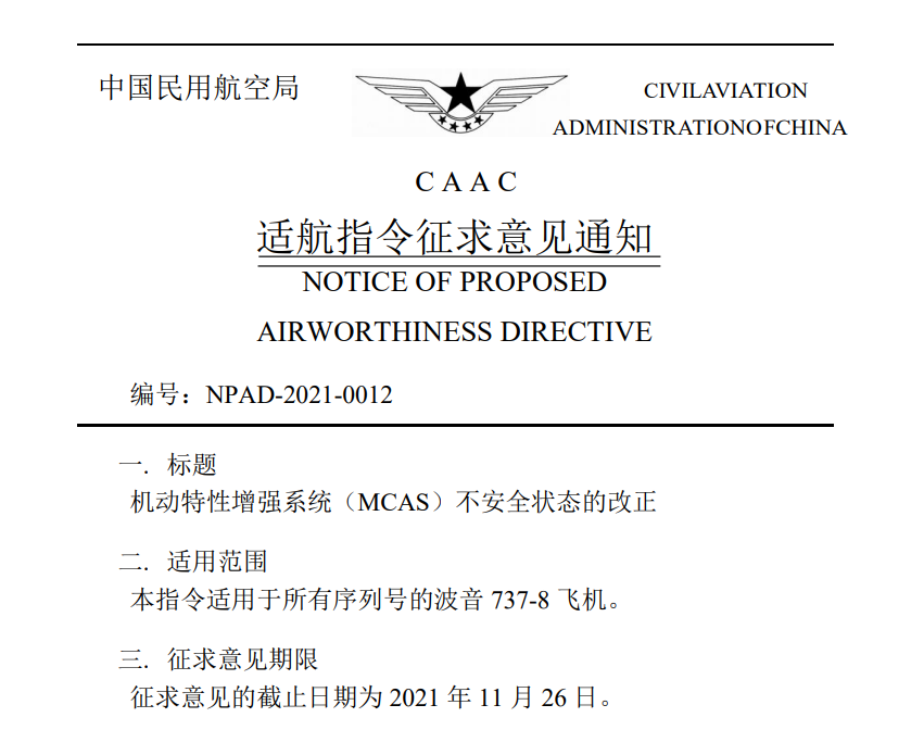 基于以上情况,为了消除上述不安全状态,中国民用航空局颁发本适航指令,替代 CAD2018-B737-21,要求贯彻实施飞行控制计算机操作程序软件(FCC OPS)的安装与验证、MAX 显示系统软件(MDS)的安装与验证、水平安定面配平线束敷设的改装、迎角(AOA)传感器系统的测试、安装失速警告系统抖杆跳开关按键(带有颜色的键帽)、飞机飞行手册的修订、MEL 的修订等改正措施。