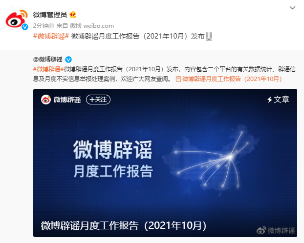 15 日消息,今日,微博官方发布了微博辟谣月度工作报告(2021 年 10 月),内容包含两个平台的有关数据统计、辟谣信息及月度不实信息举报处理案例等。