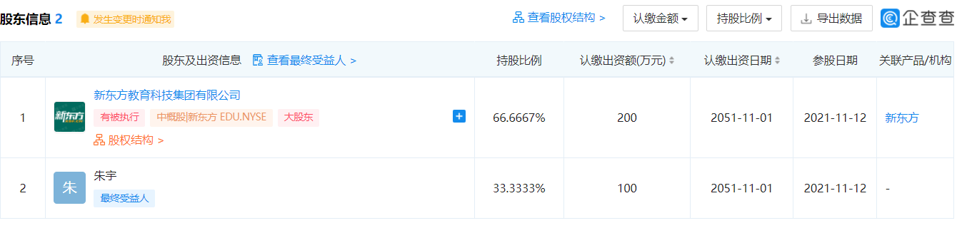 企查查 App 显示,近日,北京优编程网络科技有限公司成立,注册资本 300 万人民币,法定代表人为朱宇,经营范围包括软件开发;模型设计;教育咨询;销售文化用品、计算机、软件及辅助设备等。股东信息显示,该公司由新东方教育科技集团有限公司、朱宇分别持股约 66.67%、33.33%。