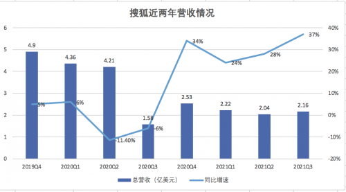 11 月 15 日,搜狐公布 2021 年第三季度财报。报告期内,搜狐实现总收入 2.16 亿美元,同比增长 37%;非美国通用会计准则下持续经营业务净利润为 1700 万美元,连续四个季度实现盈利。