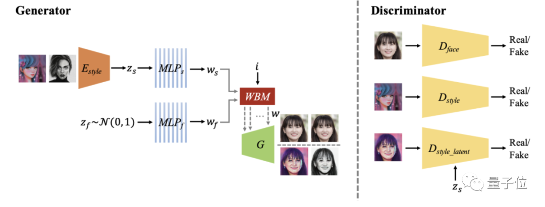 在生成器部分,则提出了一种叫做加权混合模块 (WBM) 的方法,来隐式混合人脸和样式表示,并控制任意的程式化效果。