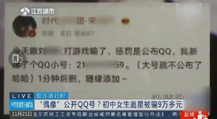 江苏苏州,喜欢追星的初中生小雨,从同学处得知自己的“偶像”输了游戏后在网上公布了QQ账号,便添加了该QQ为好友。随后,小雨被拉进粉丝群,参加所谓的充值返现福利活动,用家长手机向对方指定的账户转账了9万多元。