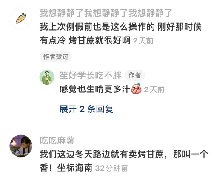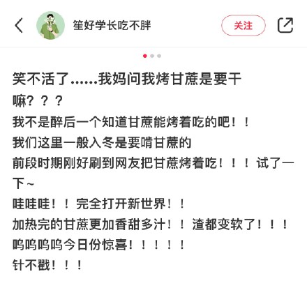 小时候取一节甘蔗,一定要带着皮,等妈妈用柴火烧灶时,往里丢,看着汁水滋滋往外冒时就可以用火钳夹出来了,找来一块布把皮外面的黑灰抹净就可以开吃了,特别适合冬天和家人蹲在火炉房吃,如果喜欢的话,还可以来个考橘子 ?
