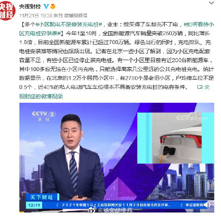 多个 小区配电不足停装充电桩 ,业主:我买得了车却充不了电, 如何看待小区充电桩安装难 】今年1至10月,全国新能源汽车销量突破250万辆,同比增长1.8倍,目前全国新能源车累计已超过700万辆。绿色出行的同时,充电排队、充电桩安装难等情况也频频出现。记者在北京一些小区了解到,因为小区充电配套容量不足,有些小区已经停止装充电桩。有一个小区里目前有近200台新能源车,其中100多台无法在小区内充电,只能选择离家几公里远的公共充电桩充电。统计数据显示,在北京的1.2万个居民小区中,有2700个是老旧小区,户均停车位不足0.5个,近40%的私人电动汽车车位根本不具备安装充电桩的电容条件。