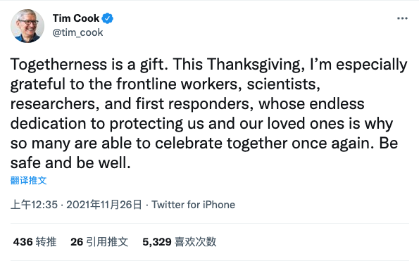 “团聚是一种礼物。这个感恩节,我尤其要感谢一线工作人员、科学家、研究人员和急救人员。他们为保护我们和我们的亲人做出了无穷无尽的奉献,这就是为什么这么多人能够再次一起庆祝的原因。祝大家平安健康。”库克在推文中称。