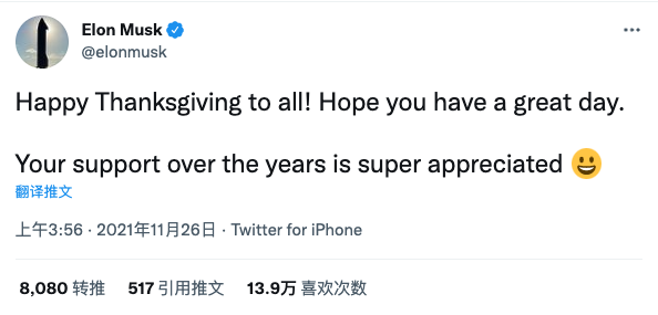 马斯克发布推文称:“祝大家感恩节快乐!祝你们度过愉快的一天。非常感谢你们这么多年来的支持。”