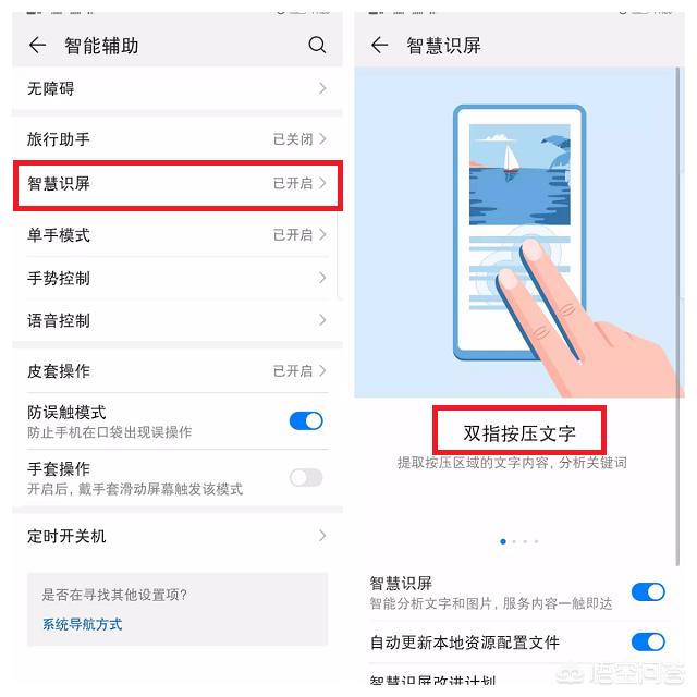 方法:设置→智能辅助→智慧识屏→点击开启按钮