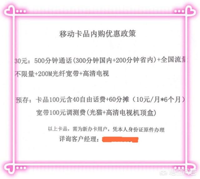 2018年家里装中国移动的手机套餐宽带,优惠政策只针对新入网的手机宽带,于是我又办理新手机卡,就是这个每个月固定费用30元,包括:500分钟通话,20G流量,200兆宽带免费用。“通话和流量”对于我来说是完全够用的,宽带我一般都是用手机,电脑我一般都不开。