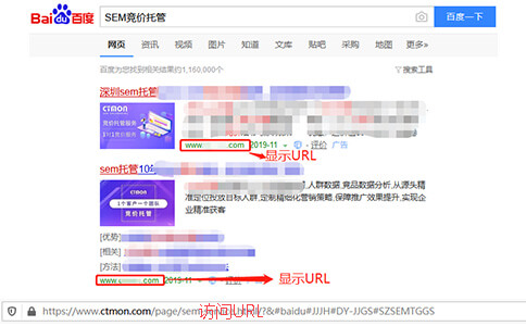 访问URL是用户搜索关键词后点击广告实际到达的网站页面链接,而显示URL是用户在搜索关键词后看到广告中显示的一行网址,如下图: