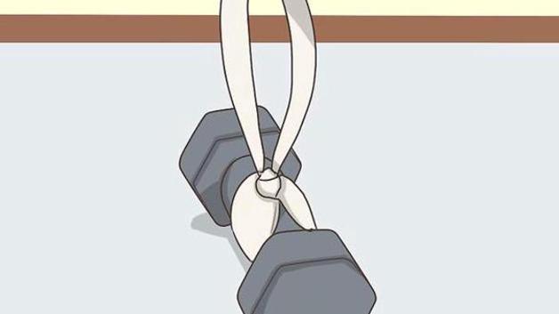 1、用绳子绑住轻重量哑铃的两头,确保中间挂在勾起的脚面上时可以形成一个三角形。