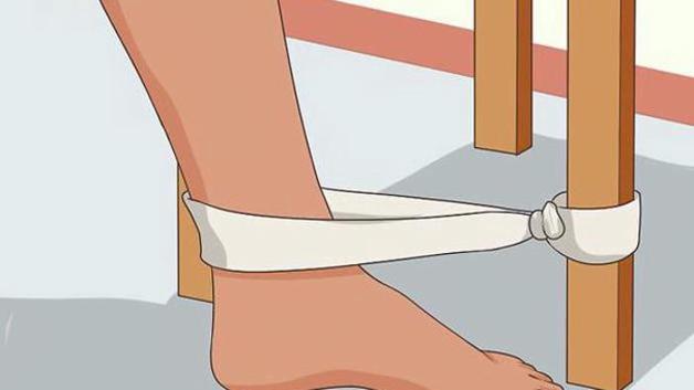 2、拉住绳子两头,向左拉使脚腕左倾。
